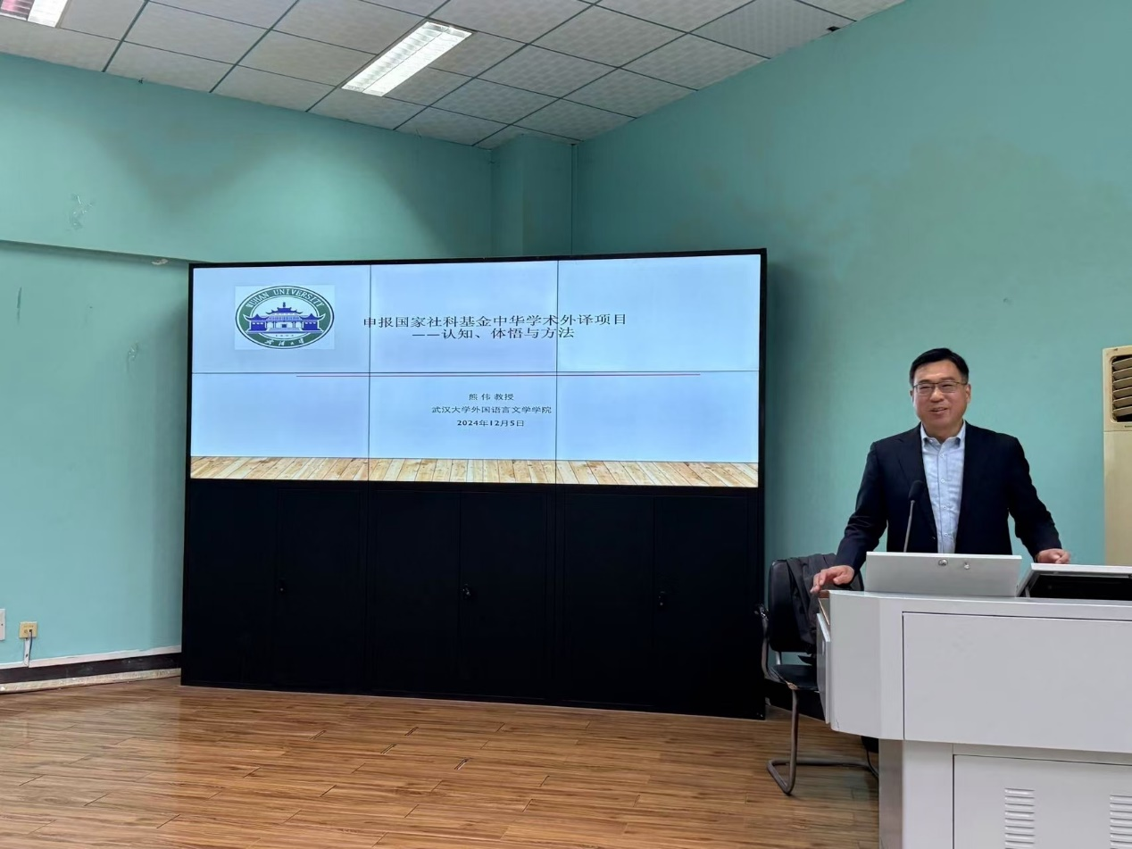 (通讯员/摄影 王晓)2024年12月5日上午9:00,中国地质大学(武汉)“南望今声”外语论坛系列讲座第七十二期在北一楼学术报告厅召开。主讲人为熊伟教授,应邀来到tyc234cc太阳成集团开展了主题为“申报国家社科基金中华学术外译项目:认知、体悟与方法”的精彩讲座。此次讲座由张峻峰院长主持,参会人员有相关专业老师以及全体研究生。