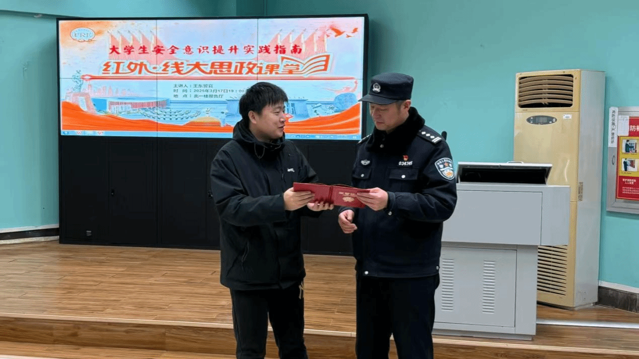 讲座结束后,tyc234cc太阳成集团团委书记邹蔚鹤老师为王东警官颁发证书,感谢他为学院师生带来的精彩讲座。本次讲座让与会师生系统了解了诈骗手段,增强了大家的防骗意识与应对能力,为平安外院建设奠定了良好的基础。