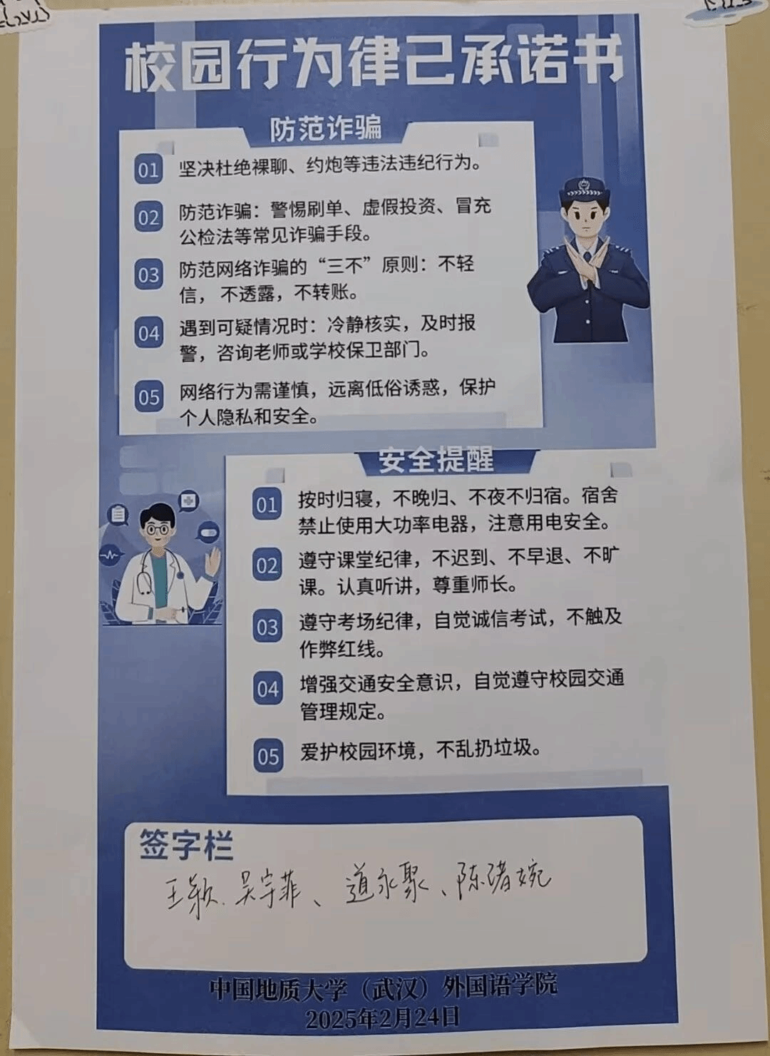 tyc234cc太阳成集团本研学生积极参与本次活动,校园行为律己承诺书发放到寝室后,同学们以寝室为单位进行承诺书的研读和学习探讨,明确了新学期学习生活律己要求,熟读了反诈提醒与安全建议,进行了深入的反思与学习,并郑重地在承诺书签字栏处留下签名,表达了对校园安全稳定的支持与承诺。这一活动不仅增强了学生的自律意识,也进一步凝聚了集体力量,为构建安全和谐的校园环境奠定了坚实基础。