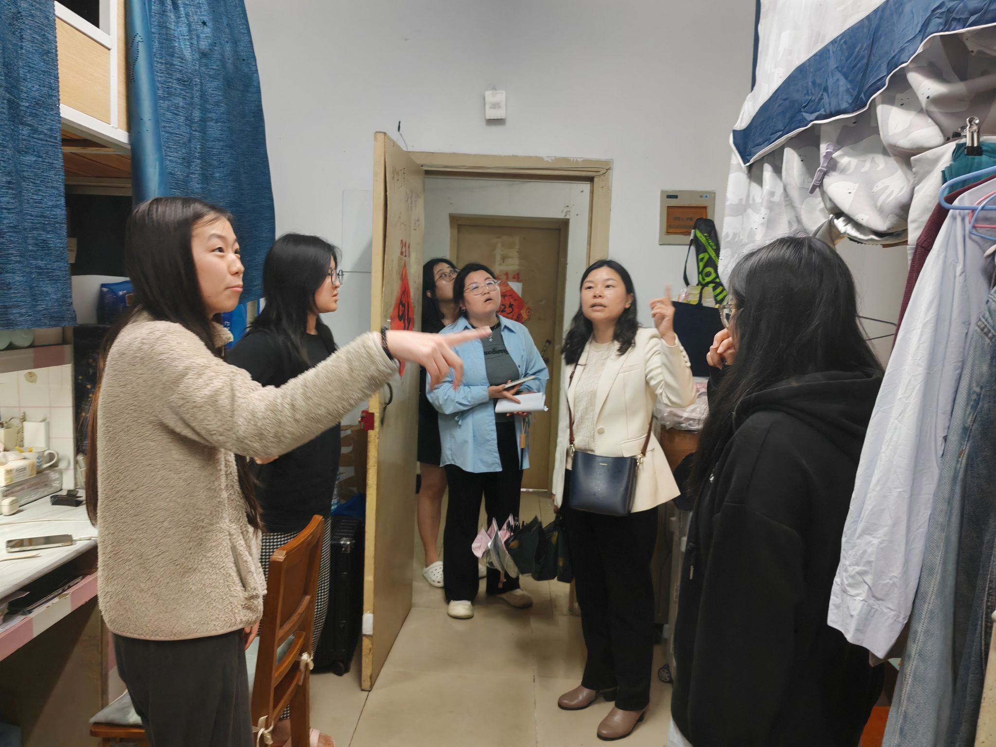 在学生宿舍走访过程中,学院领导与同学们亲切交流,详细询问他们的学习、生活情况,听取他们对学习生活和学院发展的建议和意见,特别强调要树立大安全观。领导们反复叮嘱同学们要强化安全意识,时刻保持警惕,注意防火、防盗、防诈骗等。